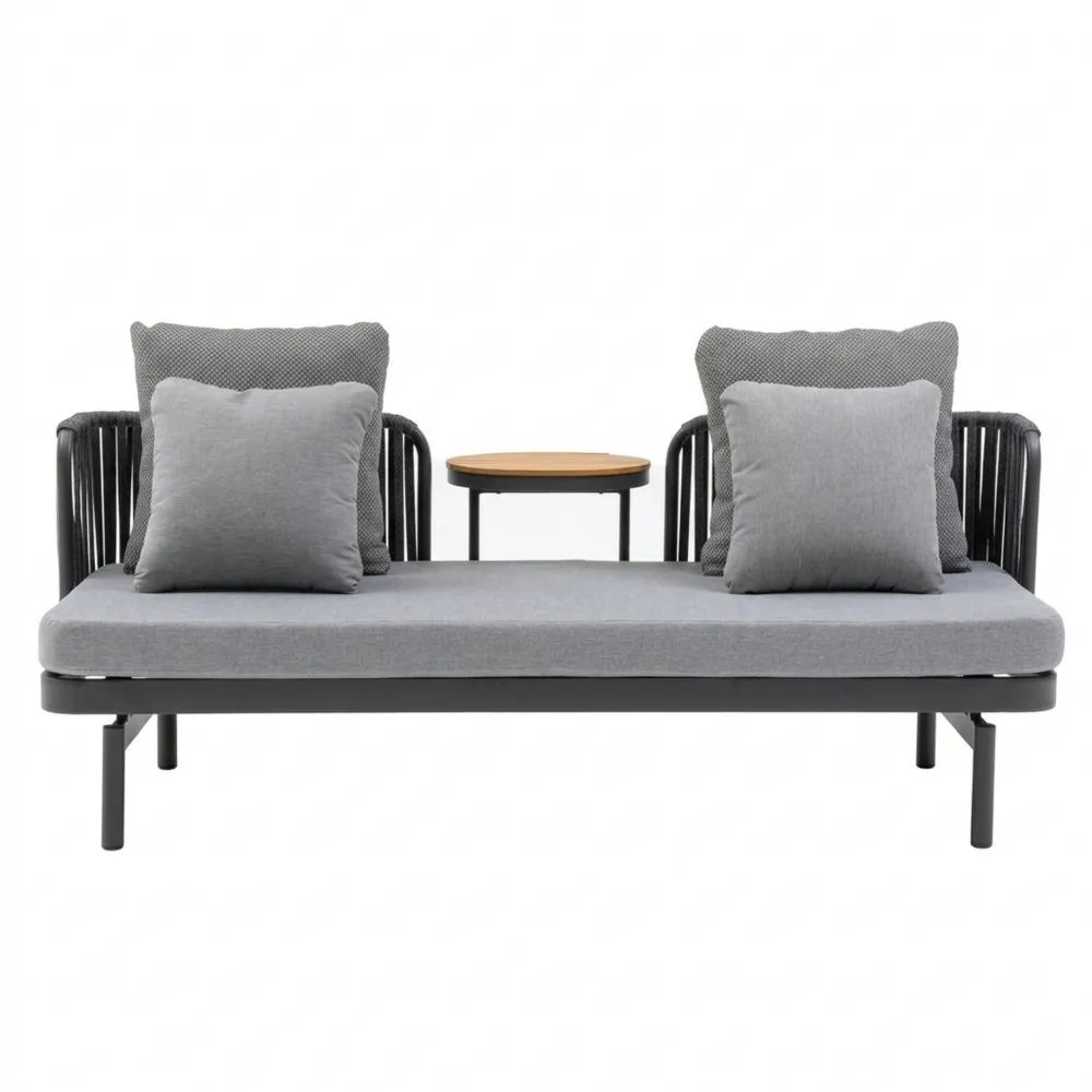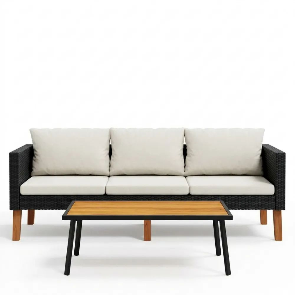 Dieses stilvolle Outdoor-Sofa mit passendem Tisch vereint Komfort und modernes Design. Das robuste Geflecht sorgt für Stabilität und Wetterbeständigkeit, während die weichen Sitz- und Rückenkissen ein angenehmes Sitzgefühl bieten. Die Kombination aus dunklem Rahmen und natürlicher Tischplatte verleiht dem Set eine elegante Optik – ideal für Garten, Terrasse oder Balkon.